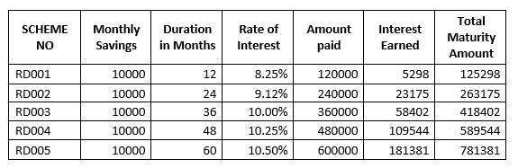 Recurring deposit account is opened by those who want to save regularly for a certain period of time and earn a higher interest rate. In recurring deposit account Minimum amount Rs.1000/- and multiplies of 500/- is accepted every month for a specified period (1year to five year) and the total amount is repaid with interest at the end of the particular period.